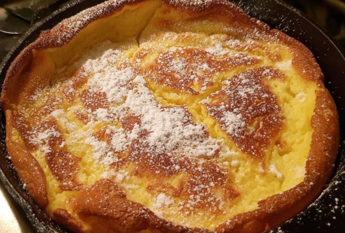 Pour the batter into the hot skillet with melted butter. Bake for 22–25 minutes, or until golden brown and puffed.
