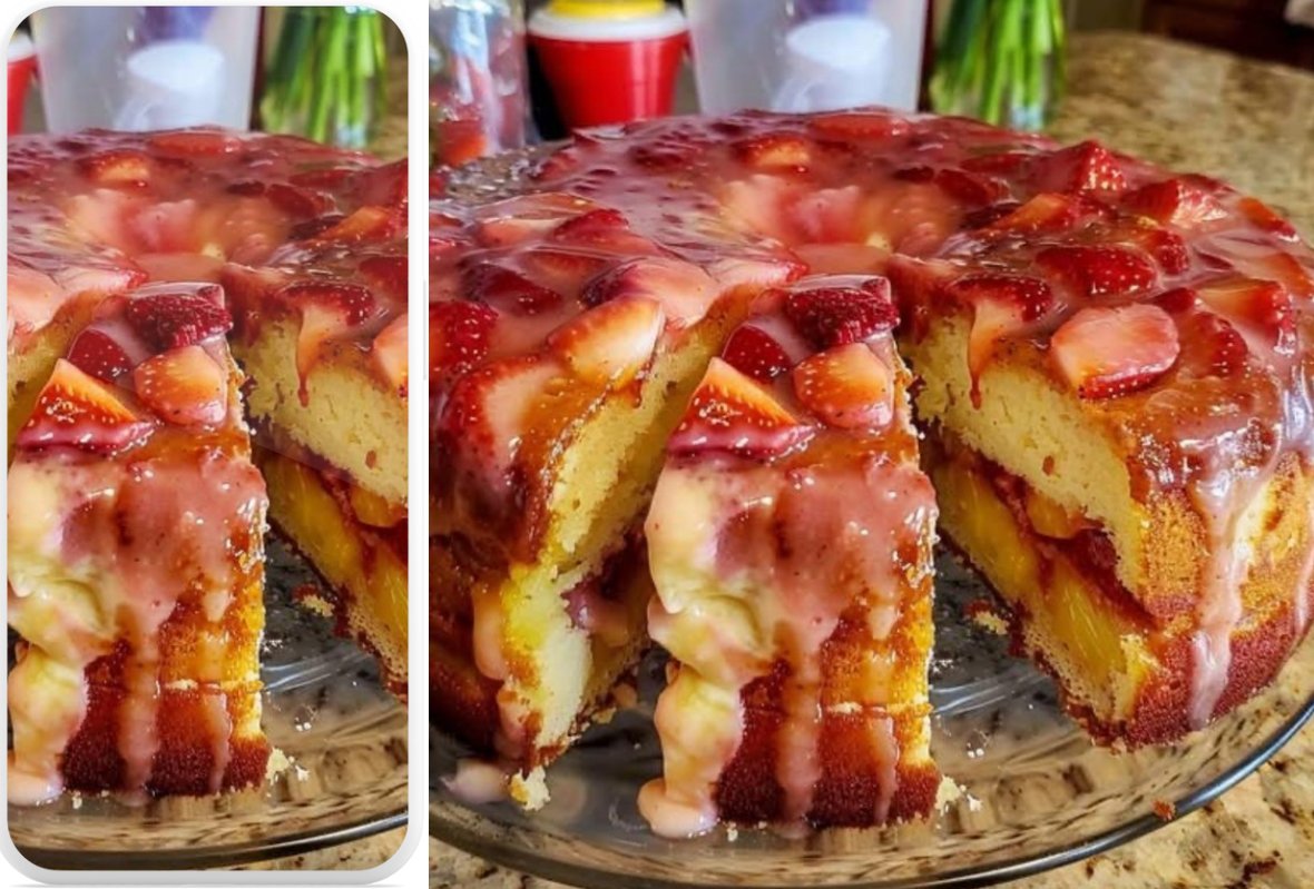 The pineapple-strawberry compote layer adds both visual appeal and fruity richness. The lightly thickened fruit swirls into the batter during baking, creating a marbled effect and juicy pockets of flavor in every slice. It’s a stunning cake for special occasions or simple family desserts.
