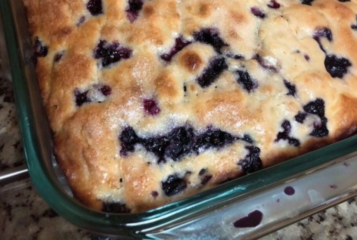 Gently fold in floured blueberries and pour the batter into the prepared baking dish. Sprinkle the top with remaining 1 tablespoon sugar for a slight crunch.