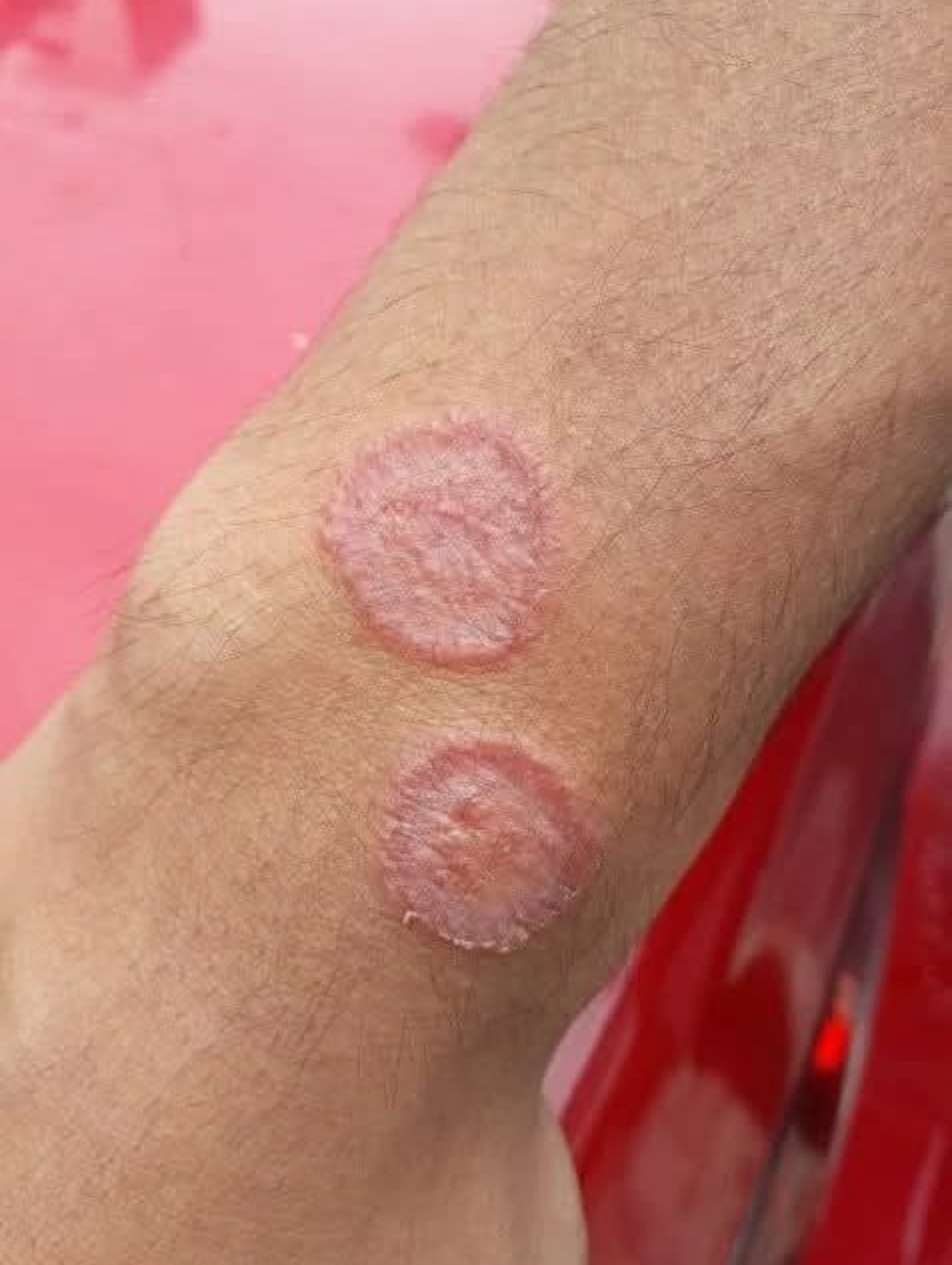 - Body (tinea corporis): Circular, itchy, red rash with raised edges.